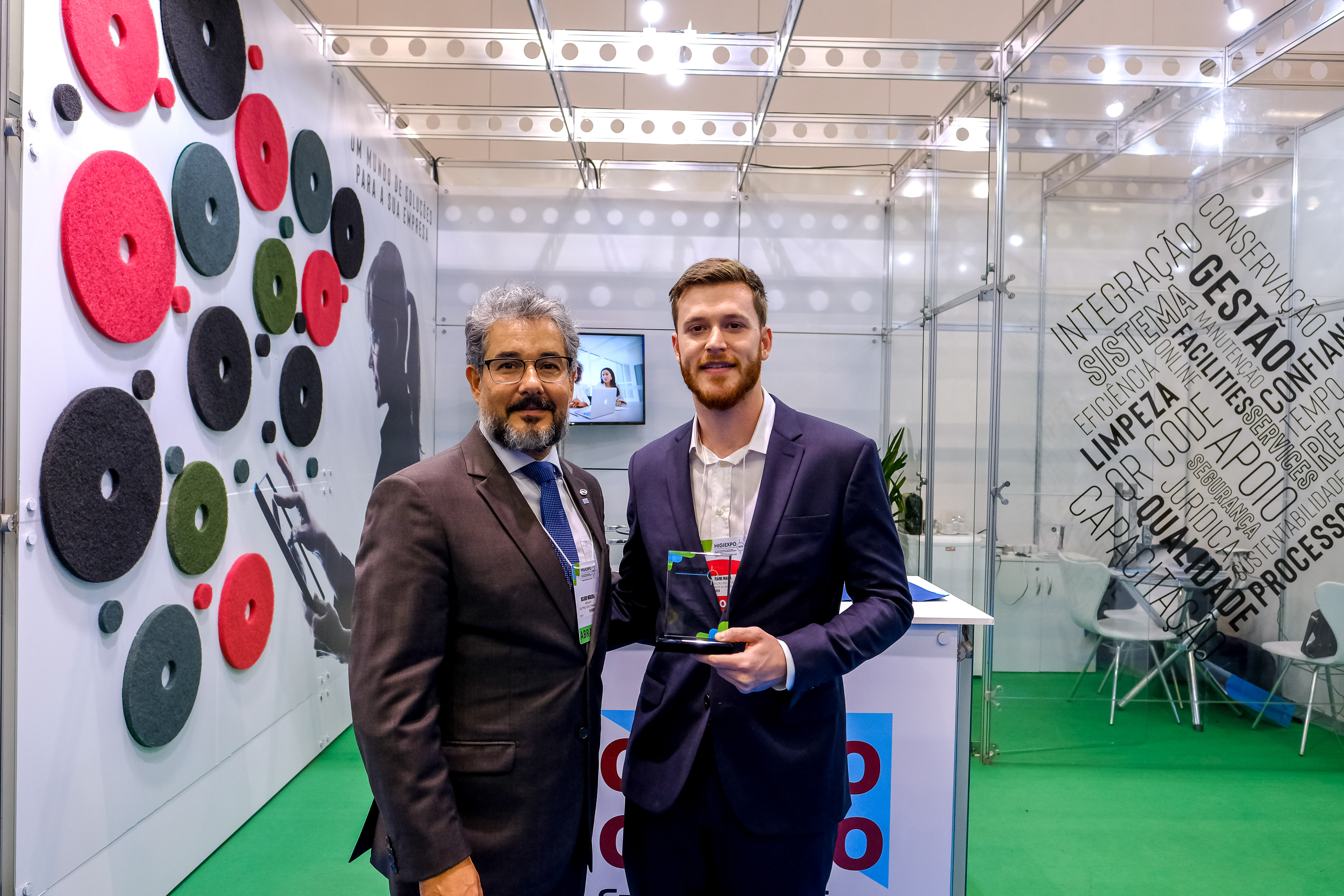 Nosso Gerente de Operações, Icaro Mana, recebeu o troféu de participação na Higiexpo 2019, do vice-presidente administrativo financeiro, Ricardo Nogueira.